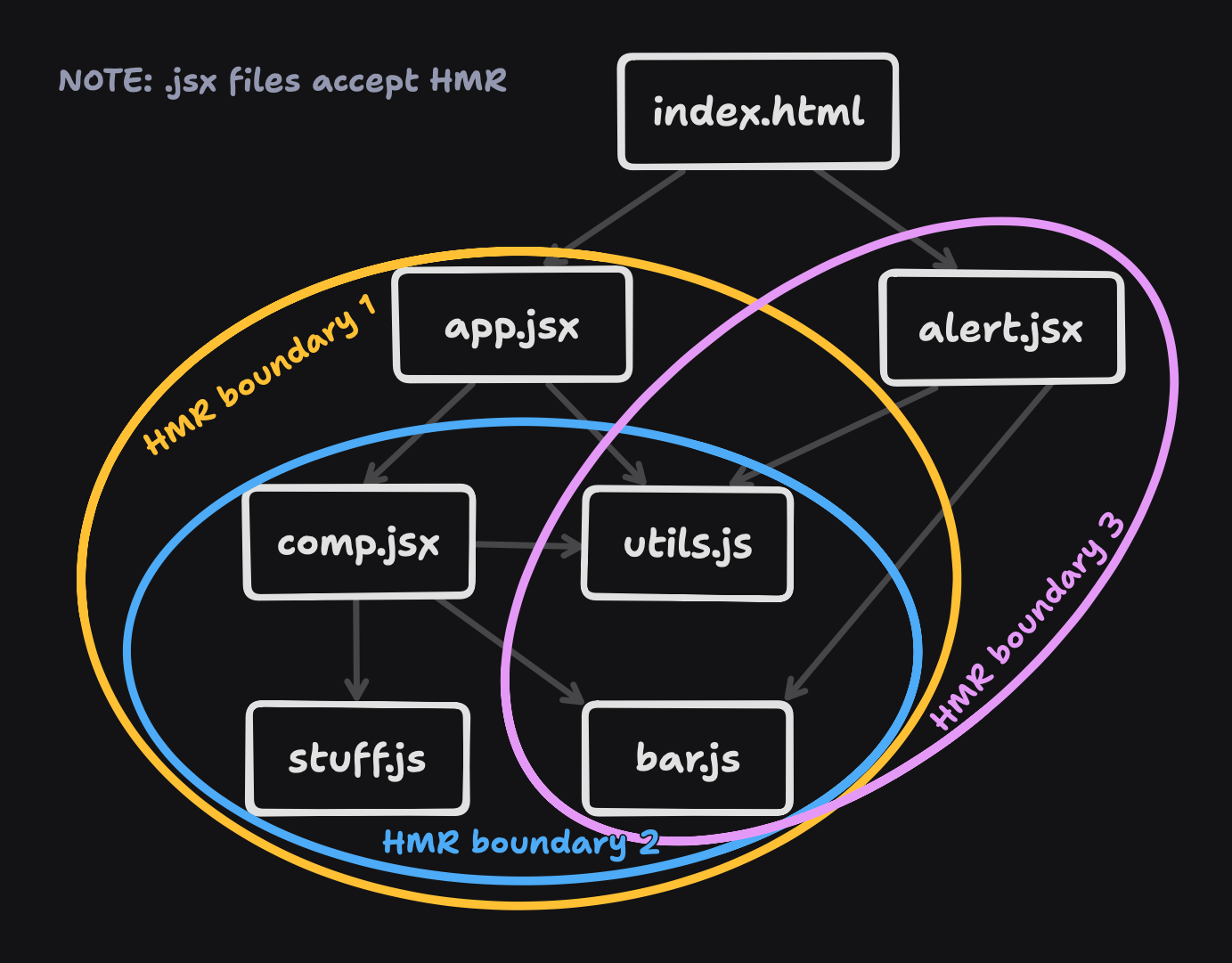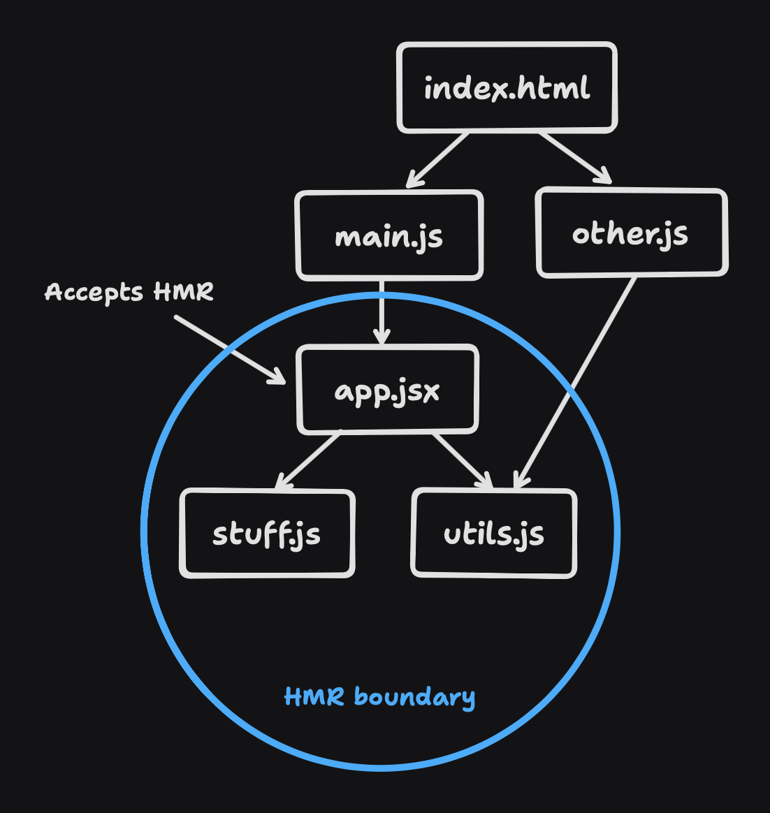 Accepted modules create an HMR boundary. The HMR boundary includes the module itself and all recursively imported modules (all parent modules that depend on the current module and all their ancestor modules). The accepted module is also the "root" of the HMR boundary, as this boundary is typically a graph structure.